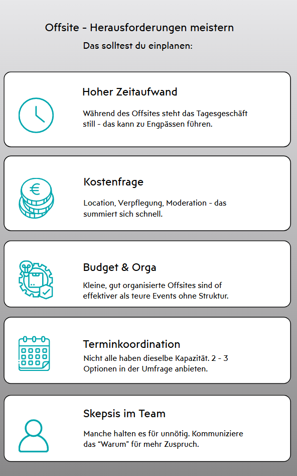 Damit ein Offsite-Event sein volles Potenzial entfaltet, ist gründliche Planung und professionelle Umsetzung entscheidend. Hier sind konkrete Tipps – von der Vorbereitung bis zur Nachbereitung – um Ihr Offsite erfolgreich zu machen: